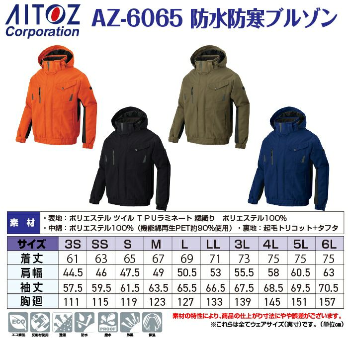 作業服 作業着 防寒着 アイトス Aitoz 作業服 防寒着 AZ-6065 防水防寒ブルゾン ユニセックス 3S-LL 秋冬 作業着 防風 防水 保温