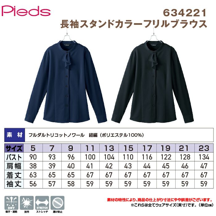 オフィス 事務 ビジネスウェア オフィスウェア ピエ 634221 長袖スタンドカラーフリルブラウス 5号-15号 オールシーズン アイトス Aitoz