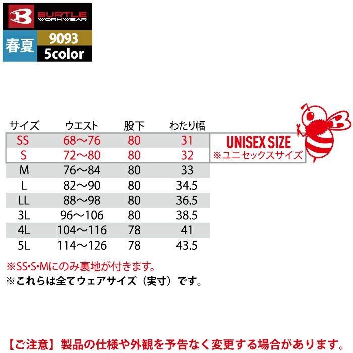 バートル BURTLE 作業着 作業ズボン 9093 ユニセックスパンツ 5L 作業服