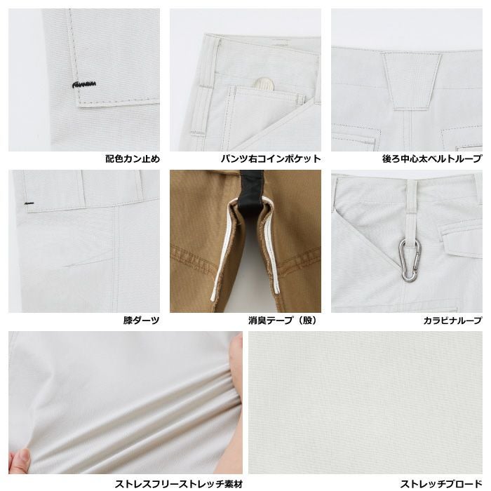 ●関連商品※WA11901長袖ブルゾン※WA11905ノータックカーゴパンツ※WA11909長袖シャツ●春夏用●素材:ストレッチブロード●混率:綿100%、ファスナー/[フロント]金属、ボタン/金属、国内生地●ストレッチ、防汚、配色カン止め、パンツ右コインポケット、後ろ中心太ベルトループ、膝ダーツ、カラビナループ、消臭テープ( 脇・股 )●サイズ:70(ウエスト/70、股下/80)、73(ウエスト/73、股下/80)、76(ウエスト/76、股下/80)、79(ウエスト/79、股下/80)、82(ウエスト/82、股下/80)、85(ウエスト/85、股下/80)、88(ウエスト/88、股下/80)、91(ウエスト/91、股下/80)、95(ウエスト/95、股下/80)、100(ウエスト/100、股下/78)、105(ウエスト/105、股下/78)、110(ウエスト/110、股下/78)、120(ウエスト/120、股下/78)●カラー:ネイビー、ブルー、ストーングレー、キャメル、チャコール