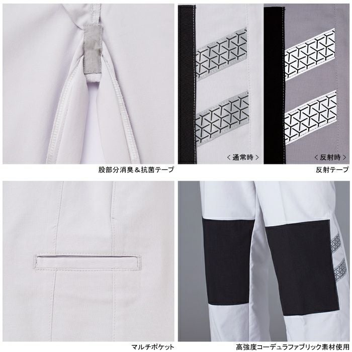 ●関連商品※87300ストレッチ長袖ジャンパー※87301ストレッチノータックパンツ※87302ストレッチノータックカーゴパンツ※87304ストレッチ長袖シャツ※87316ストレッチレディースカーゴパンツ(裏付)●オールシーズン用●素材:[身生地]ボディフィール交織グログラン(ポリエステル80%・綿20%) [別生地]コーデュラ(ナイロン100%)●レディース・ペア、消臭&抗菌テープ、マルチポケット、反射テープ、高強度コーデュラファブリック素材使用●サイズ:59(ウエスト/72、ヒップ/90、ワタリ幅/30.5、股下/75)、61(ウエスト/74、ヒップ/92、ワタリ幅/31、股下/75)、64(ウエスト/77、ヒップ/95、ワタリ幅/32、股下/75)、67(ウエスト/80、ヒップ/98、ワタリ幅/33、股下/75)、70(ウエスト/83、ヒップ/101、ワタリ幅/34、股下/75)、73(ウエスト/86、ヒップ/104、ワタリ幅/35、股下/75)、76(ウエスト/89、ヒップ/107、ワタリ幅/36、股下/75)、81(ウエスト/94、ヒップ/112、ワタリ幅/37、股下/75)、86(ウエスト/99、ヒップ/117、ワタリ幅/38、股下/75)、91(ウエスト/104、ヒップ/122、ワタリ幅/39、股下/75)、96(ウエスト/109、ヒップ/127、ワタリ幅/40、股下/75)、101(ウエスト/114、ヒップ/132、ワタリ幅/41、股下/75)●カラー:ネービー、シルバー、ブラック、ロイヤルブルー