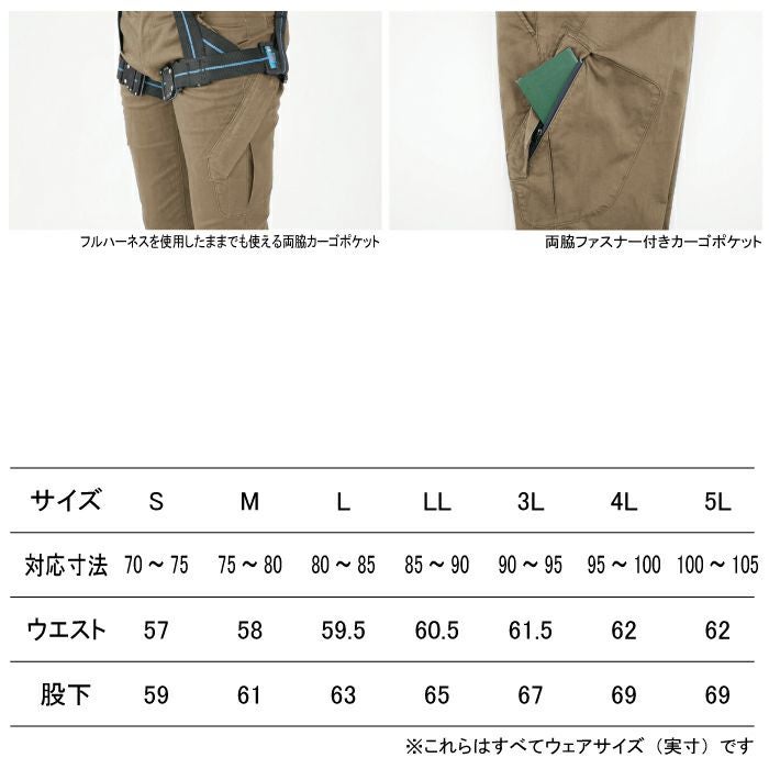●関連商品※2231半袖ブルゾン※2233長袖シャツ※2234長袖ブルゾン※2236カーゴパンツ●オールシーズン用●素材:ストレッチスラブツイル●混率:綿98%・ポリウレタン2%、樹脂ファスナー●伸縮素材、洗い加工、[両脇]フルハーネスをしたままでも使えるカーゴポケット。ファスナー付きカーゴポケット、[後ろ]後ピスポケットは長財布も入る深さ(右はファスナー付き)、[裾]シャーリング仕様でカジュアルに●サイズ:S(対応寸法/70~75、ウエスト/75、股下/80)、M(対応寸法/75~80、ウエスト/80、股下/80)、L(対応寸法/80~85、ウエスト/85、股下/80)、LL(対応寸法/85~90、ウエスト/90、股下/80)、3L(対応寸法/90~95、ウエスト/95、股下/80)、4L(対応寸法/95~100、ウエスト/100、股下/80)、5L(対応寸法/100~105、ウエスト/105、股下/80)●カラー:アイアンブルー、グレー、キャメル、ストーンブラック