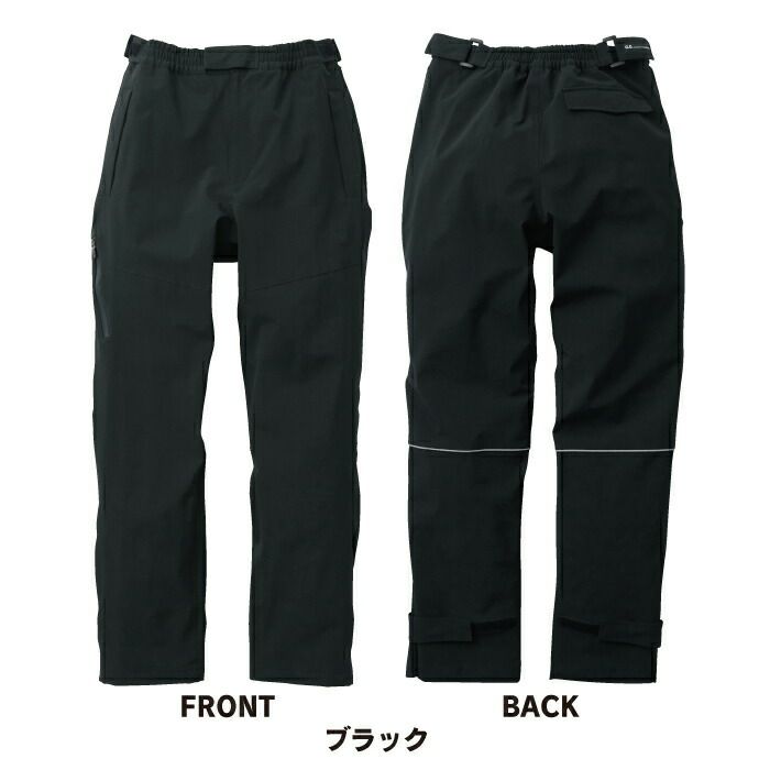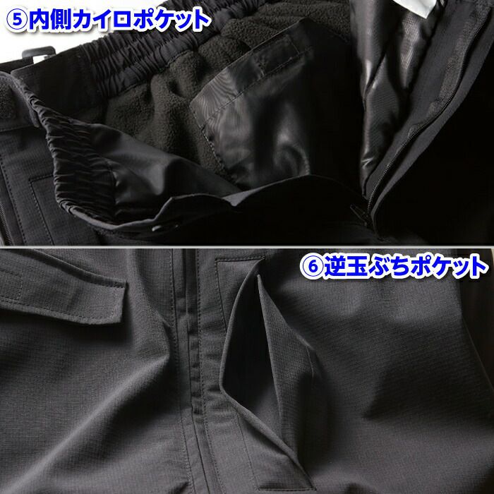 ◇機能:ウエストゴム、ウエストアジャストテープ、後身頃上部裏フリース、ひざ部分裏フリース、内側カイロポケット、逆玉ぶちポケット、両脇スルーファスナー、止水ファスナーポケット、反射パイピング、裾アジャストテープ