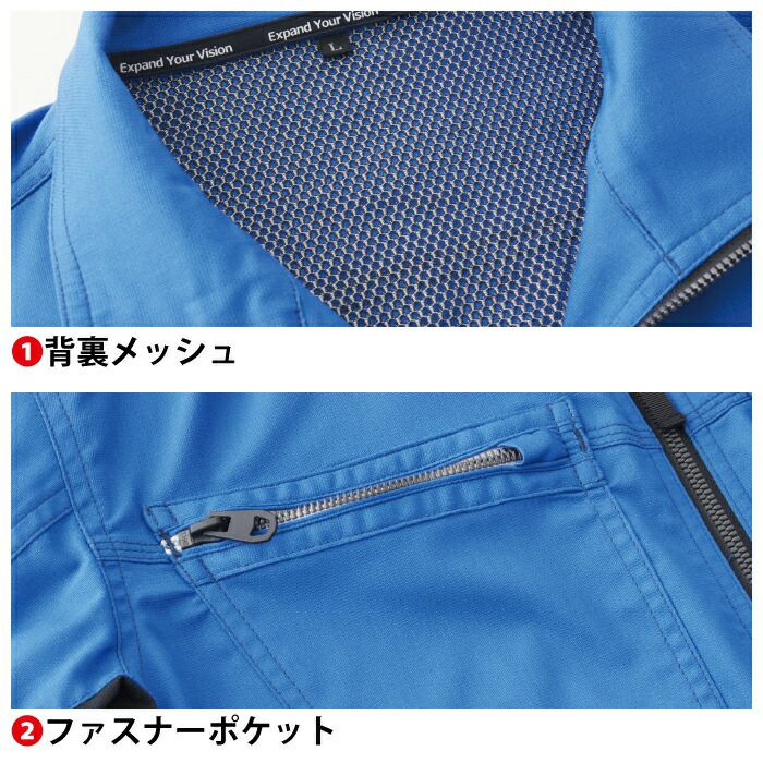 ◇背裏メッシュ・ファスナーポケット・胸二重ポケット(野帳が入る)・胸ペン差し・袖ペン差し・ネームループ(隠し)・脇ポケット・袖口ドットボタン