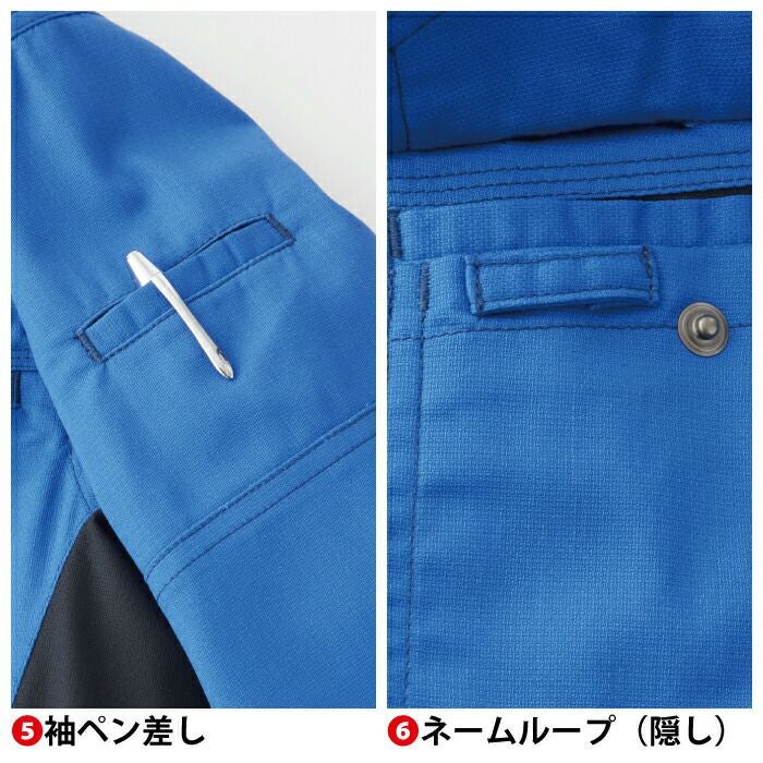 ◇背裏メッシュ・ファスナーポケット・胸二重ポケット(野帳が入る)・胸ペン差し・袖ペン差し・ネームループ(隠し)・脇ポケット・袖口ドットボタン
