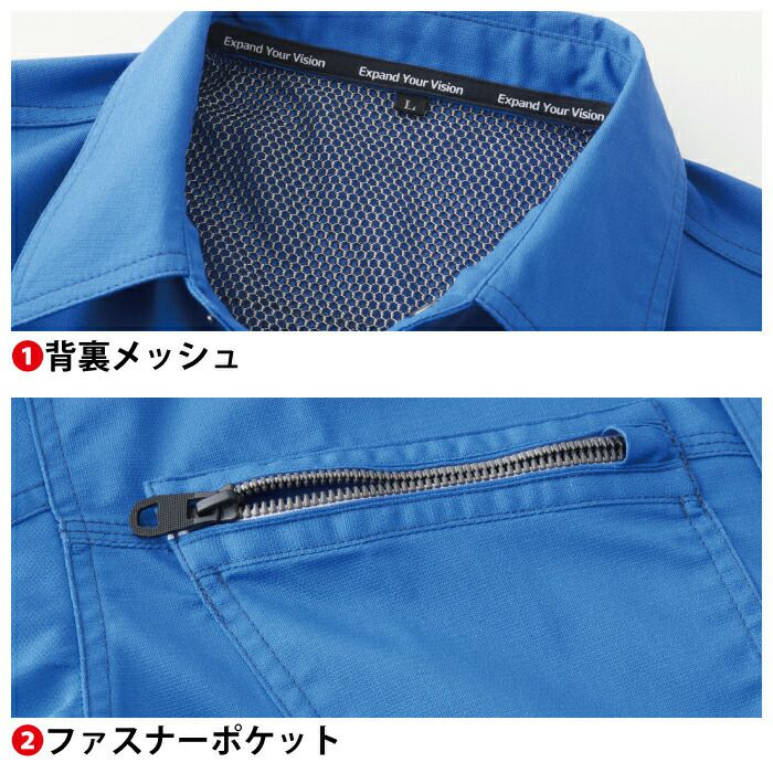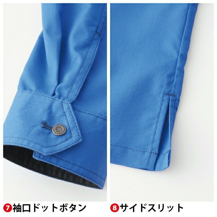 ◇背裏メッシュ・ファスナーポケット・胸二重ポケット(野帳が入る)・胸ペン差し・袖ペン差し・ネームループ(隠し)・袖口ドットボタン・サイドスリット