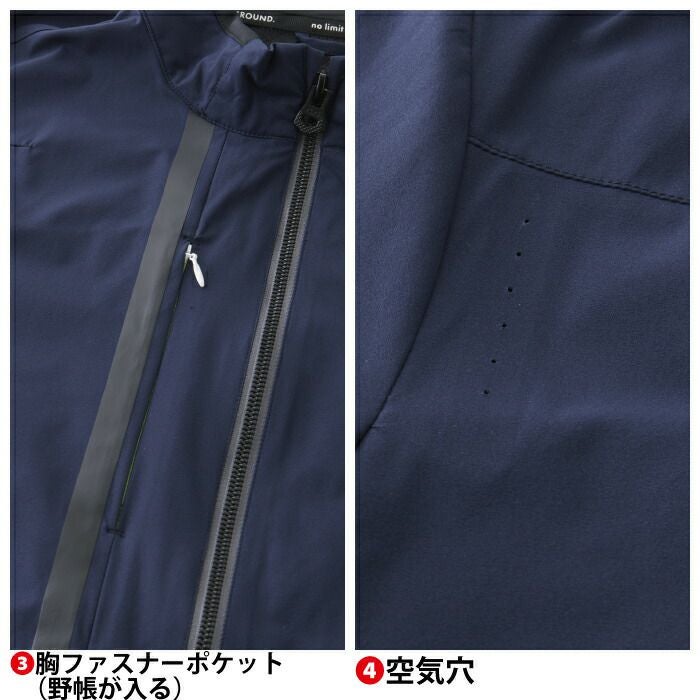 ◇冷感ナイロン素材(衿裏・袖口・裾)・ロゴ入りラインテープ・胸ファスナーポケット(野帳が入る)・空気穴・反射ロゴプリント・袖ペン差し・メッシュ素材・デオドラントテープ