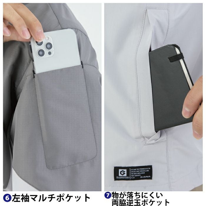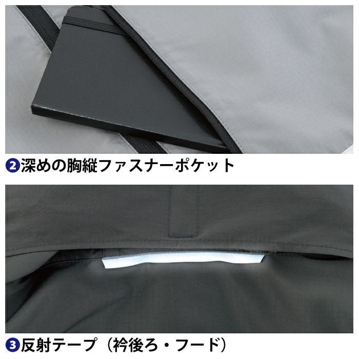 ◇機能:インフード仕様・深めの胸縦ファスナーポケット・反射テープ(衿後・フード)・袖口アジャスター・左袖マルチポケット・物が落ちにくい両脇逆玉ポケット・野帳が入るポケット