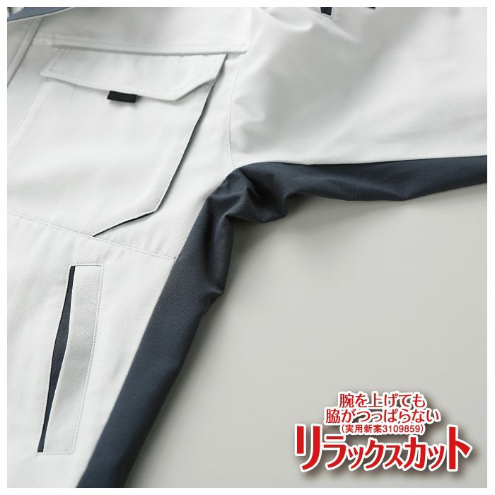 ◇腕がつっぱらないリラックスカットや物が落ちにくい斜めデザインの胸ポケットなど・随所に工夫を凝らし・夕方から夜間の作業に安心な反射パイピングを前後に施しました。