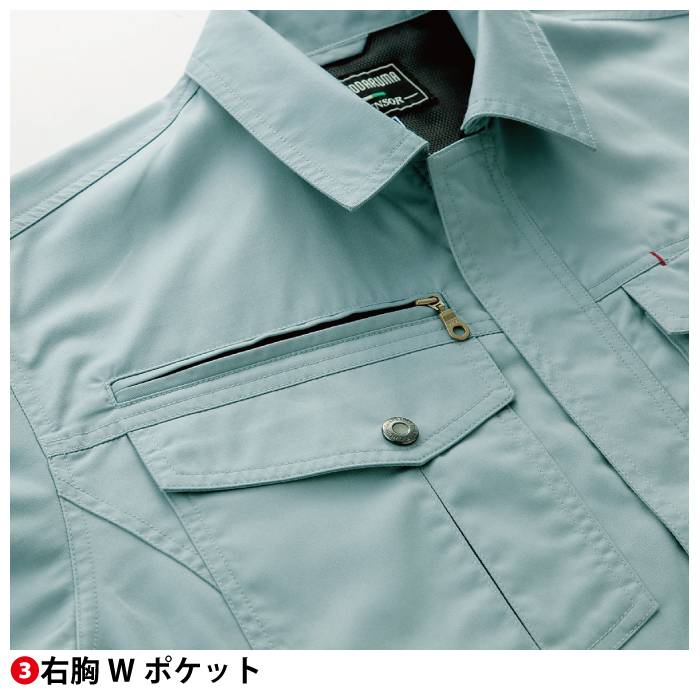 ◇機能:制電・ノーフォーク・背当メッシュ・右胸Wポケット・左右脇ポケットは物が落ちにくい逆玉仕様・左胸ペン差し・左袖ペン差し・織ネーム・袖ダーツ2本・背中のムレを軽減するノーフォークメッシュ