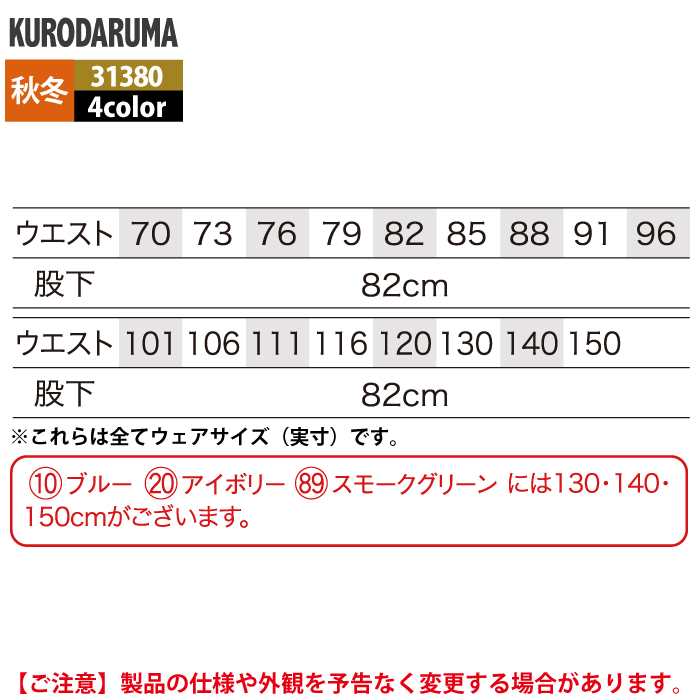 ◇ブルー・アイボリー・スモークグリーンにはウエスト130cm・140cm・150cmがございます。