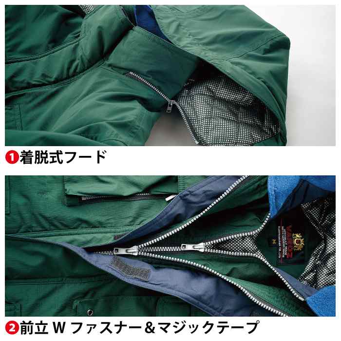 ◇機能:着脱式フード・前立Wファスナー・マジックテープ・サイドファスナーポケット・左内ポケット・袖マジックテープ・ファスナー樹脂・ボタン樹脂
