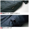 ◇機能:着脱式フード・衿ブロックフリース・両胸反射テープ付胸ポケット・前立ファスナー・マジックテープ・背反射テープ・左内ポケット・左袖ポケット(止水ファスナー)・袖マジックテープ・ファスナー樹脂・ボタン金属・耐水圧10000mm・透湿性4000g/平方メートル24h