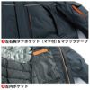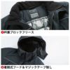 ◇機能:衿裏ブロックフリース・着脱式フード・マジックテープ隠し・前立裏ファスナー付ポケット・胸反射テープ・左右胸タテポケット(マチ付)・左内ポケット・背反射テープ・左袖ポケット(マチ付)・左右ポケット内は温かい起毛トリコットを使用・内袖(ジャージ)付・袖マジックテープにはより締め付け可能なゴム付・ファスナー樹脂・ボタン金属