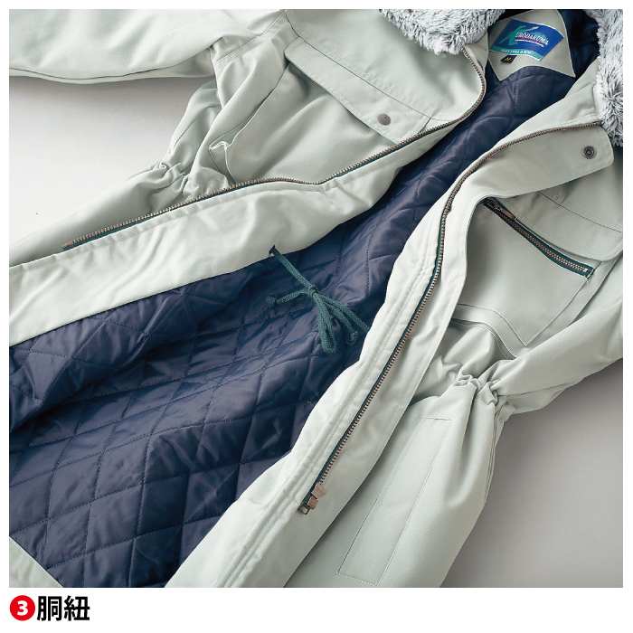 ◇機能:着脱式フード・衿ボア・左袖ペン差し・胴紐・左内ポケット・エコマーク・左右胸ポケットマチ付・ファスナー樹脂・ボタン樹脂