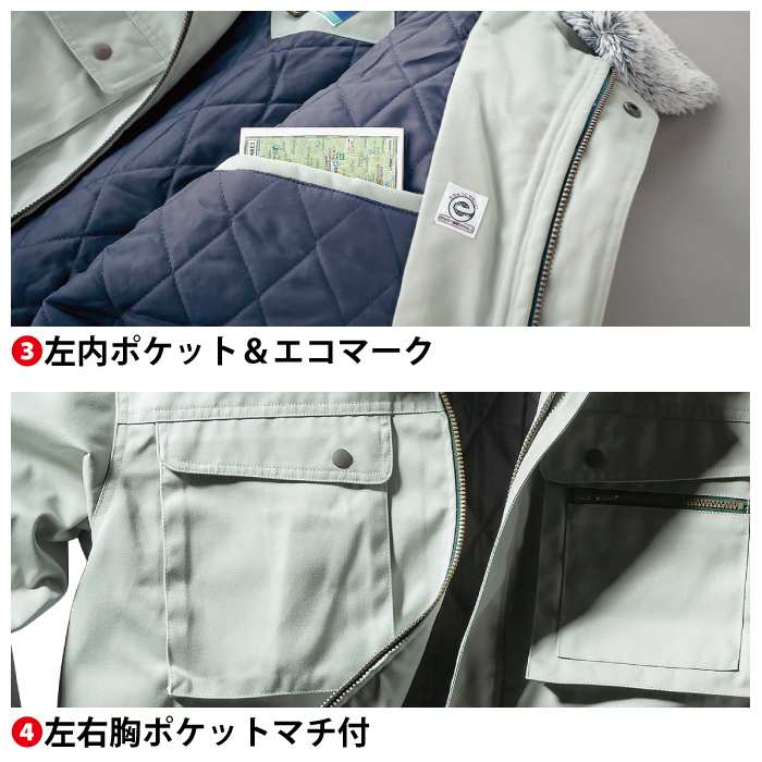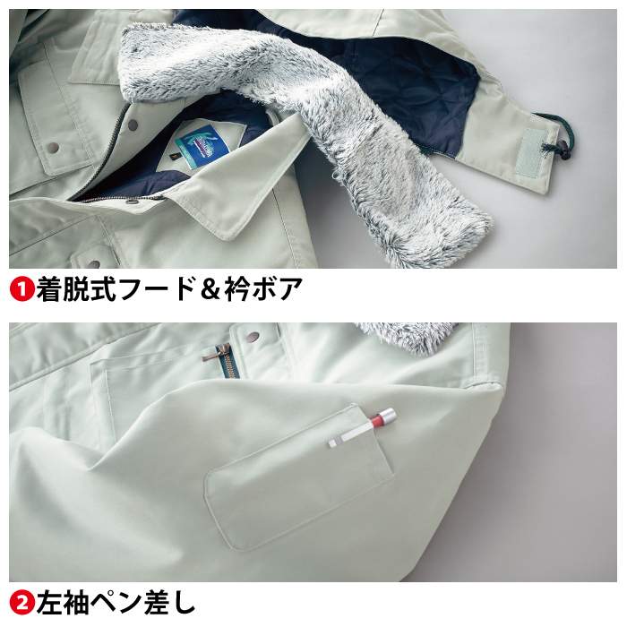 ◇機能:着脱式フード・衿ボア・左袖ペン差し・左内ポケット・エコマーク・左右胸ポケットマチ付・ファスナー樹脂・ボタン樹脂