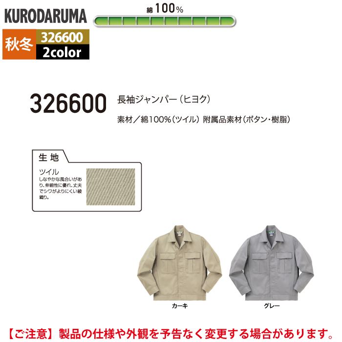 クロダルマ 作業服 秋冬用 326600 長袖ジャンパー(ヒヨク) S-LL