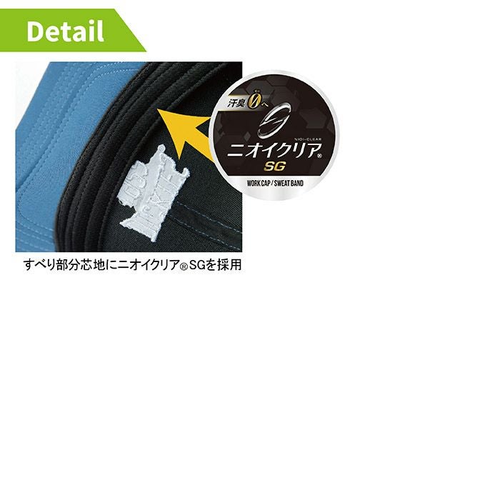 ◇帽子と内側の頭との接触部分(すべり部分)にニオイクリア芯地と吸汗のドライメッシュ素材を使用し快適さをプラス