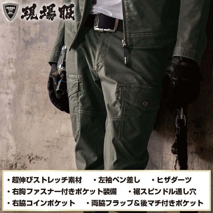 ◇機能:伸縮素材・洗い加工・左袖ペン差し・ストレッチ生地・ヒザダーツで曲げやすい・前中心は丈夫な3YGファスナー・両脇Dカンループ付き・両脇フラップと後マチ付きカーゴポケット・右脇コインポケット・裾内側スピンドル通し穴