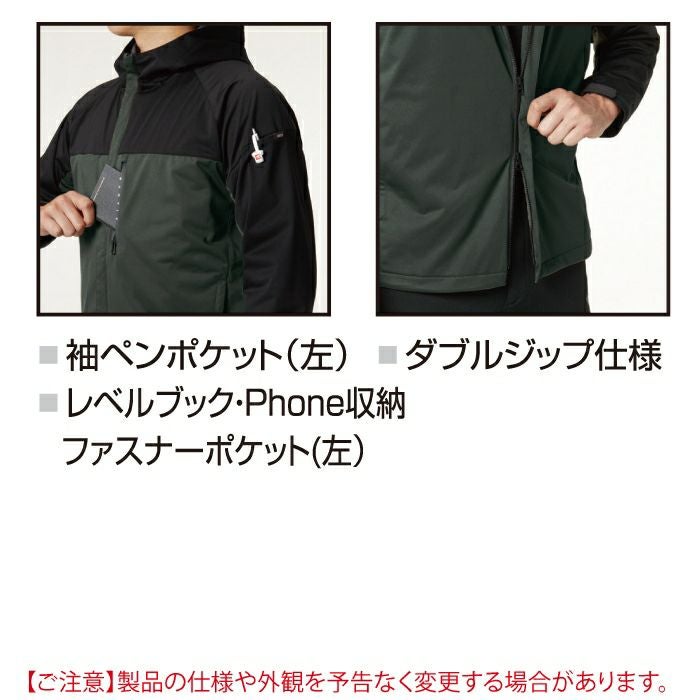 ◇素材:表地/高密度ストレッチニット(伸長率40%以上)・防風ラミネート加工(耐水圧10000mm)・強撥水加工・裏地/アルミメッシュラミネート加工(保温性)