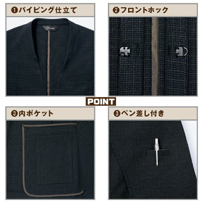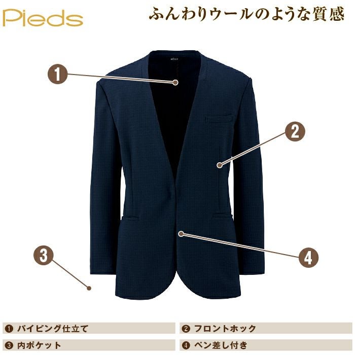 ◇機能:ホームクリーニング・左胸ポケット・両脇ポケット・内ポケット・ペン差し付(身頃内側)・パイピング仕立て・フロントホック