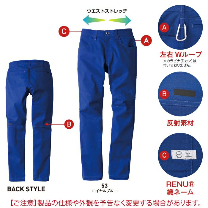 ◇ワークシーンの定番 ポリエステルと綿の耐久性とバネのような特殊な分子構造の伸縮回復性に優れたストレッチ性を兼ね備えたクラボウ品質のRENUストレッチツイル