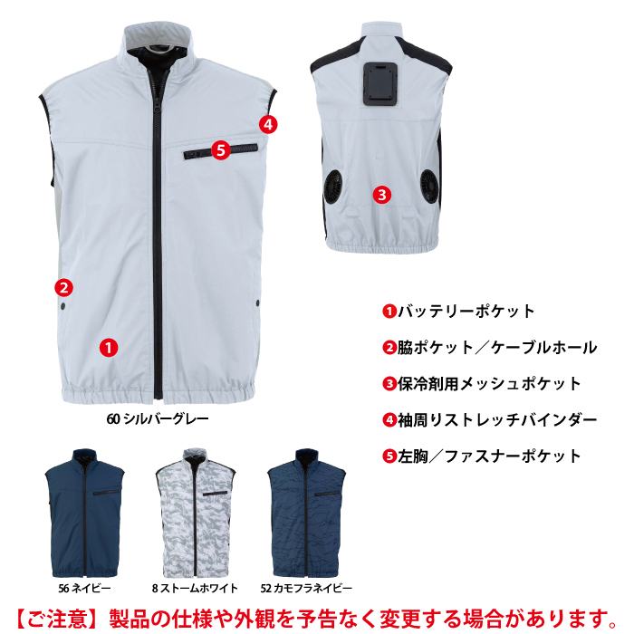 ◇機能:バッテリーポケット・脇ポケット/ケーブルホール・保冷剤用メッシュポケット・袖周りストレッチバインダー・左胸/ファスナーポケット