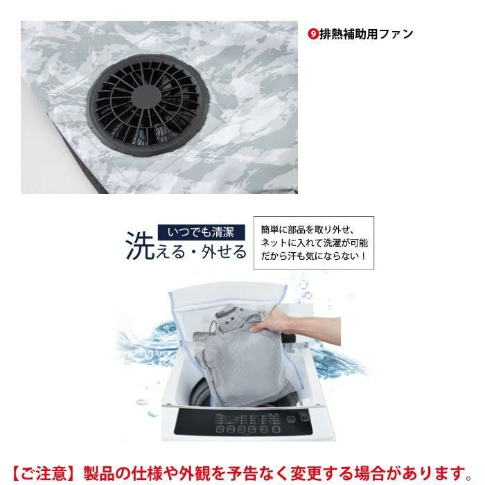 ◇機能:左胸/ファスナーポケット・袖周り/ストレッチバインダー・デバイスコードホール・モバイルバッテリーポケット・デバイスコードループ・両脇/ハトメベンチレーション・大型冷却プレート・排熱システム・排熱補助用ファン