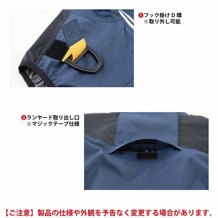 ◇機能:取り外し可能フック掛けD環・マジックテープ仕様ランヤード取り出し口・ファン脱落防止ネット仕様・左胸/ファスナーポケット・袖周り/ストレッチバインダー・保冷剤用メッシュポケット・脇ポケット/ケーブルホール・バッテリーポケット