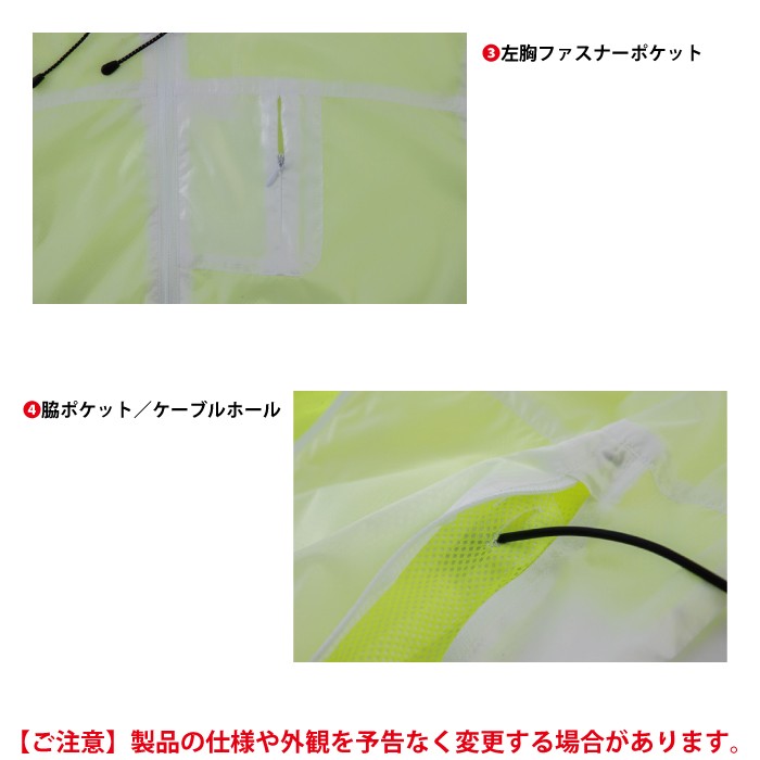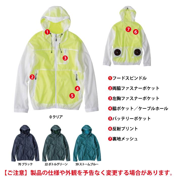 ◇機能:フードスピンドル・両脇ファスナーポケット・左胸ファスナーポケット・脇ポケット/ケーブルホール・バッテリーポケット・反射プリント・裏地メッシュ