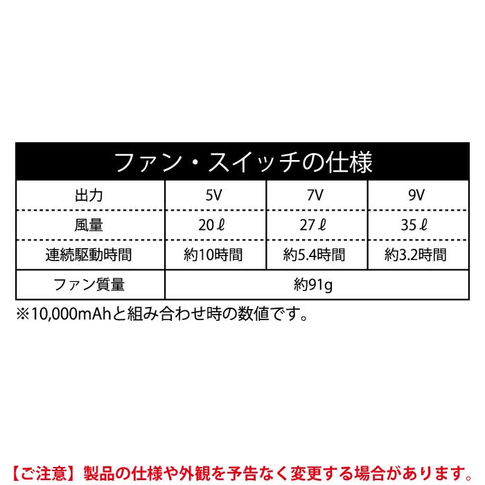 ◇ファン・スイッチの使用:出力/風量/連続駆動時間:5V/20L/約10時間:7V/27L/約5.4時間:9V/35L/約3.2時間(10000mAhと組み合わせ時の数値)