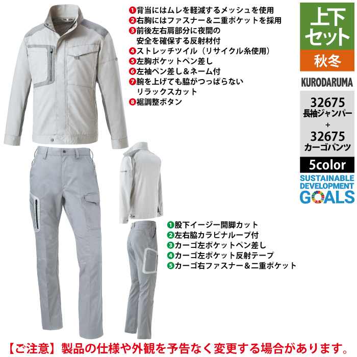 クロダルマ 作業服 上下セット 32675 長袖ジャンパーM-3L と 35675 カーゴパンツ(ノータック) 70-101 作業着 作業ズボン 秋冬用