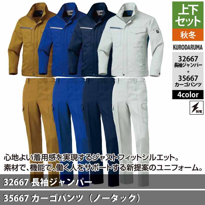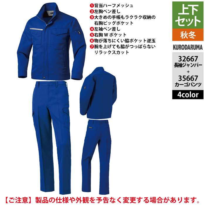 クロダルマ 作業服 上下セット 32667 長袖ジャンパーS-3L と 35667 カーゴパンツ(ノータック) 70-101 作業着 作業ズボン 秋冬用