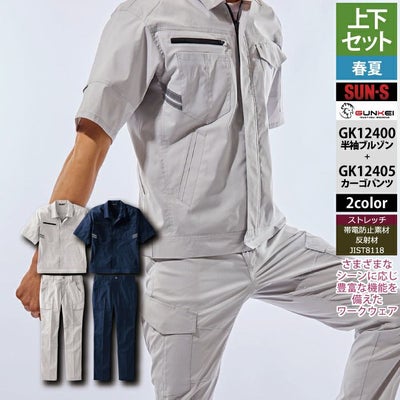 サンエス 作業服 上下セット 春夏 GK12400 半袖ブルゾンSS-3L と GK12405 カーゴパンツ 62-100 作業ズボン 作業着