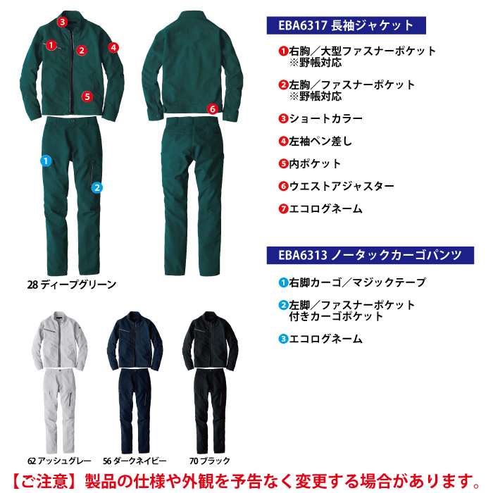 ビッグボーン bigborn 作業服 上下セット EBA6317 長袖ジャケットS-3L と EBA6313 ノータックカーゴパンツ S-3L 春夏 作業着 作業ズボン