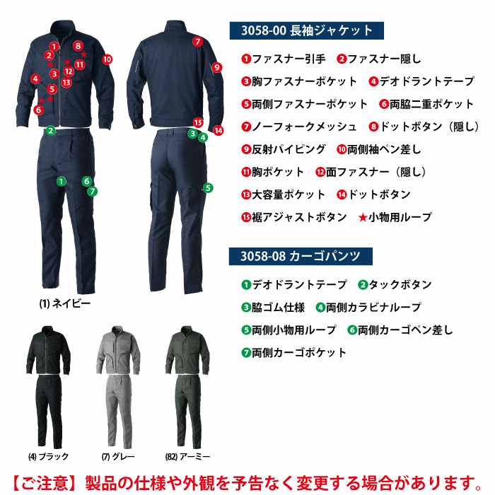 ◇機能:ファスナー引手・ファスナー隠し・胸ファスナーポケット・デオドラントテープ・両側ファスナーポケット・両脇二重ポケット・ノーフォークメッシュ・ドットボタン(隠し)・反射パイピング・両側袖ペン差し・胸ポケット・面ファスナー(隠し)・大容量ポケット・ドットボタン・裾アジャストボタン・ユニセックス対応