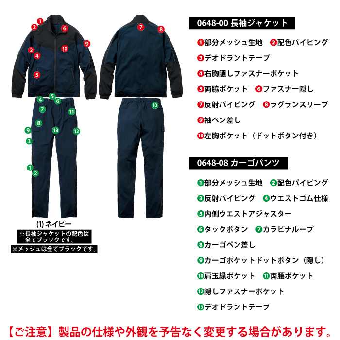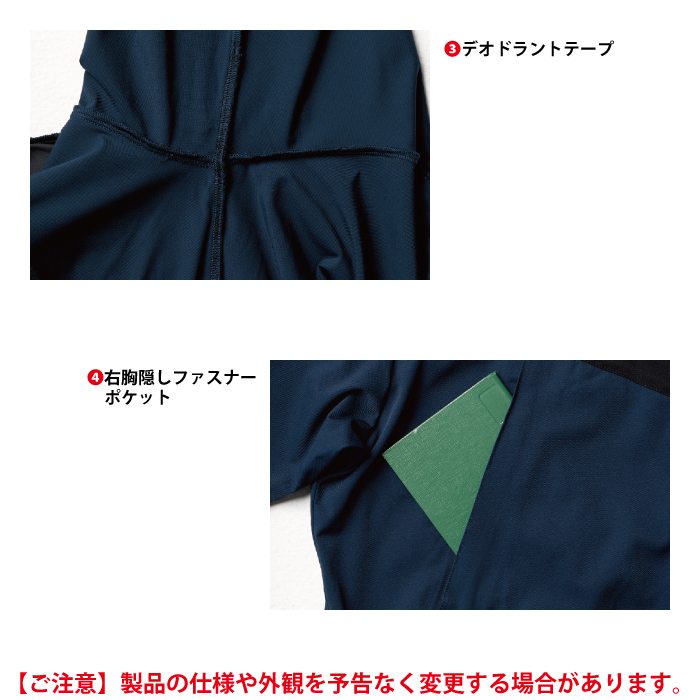 ◇機能:部分メッシュ生地・配色パイピング・デオドラントテープ・右胸隠しファスナーポケット・両脇ポケット・ファスナー隠し・反射パイピング・ラグランスリーブ・袖ペン差し・左胸ポケット(ドットボタン付き)