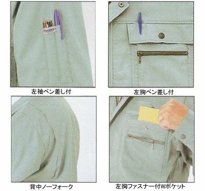 ●機能:左袖ペン差し付、左胸ペン差し付、背中ノーフォーク、左胸ファスナー付、Wポケット