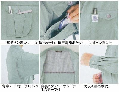 ●機能:右胸ポケット内携帯電話ポケット、左胸ペン差し付、左袖ペン差し付、背裏メッシュ+サンイオネステープ付、背中ノーフォークメッシュ、カフス調整ボタン