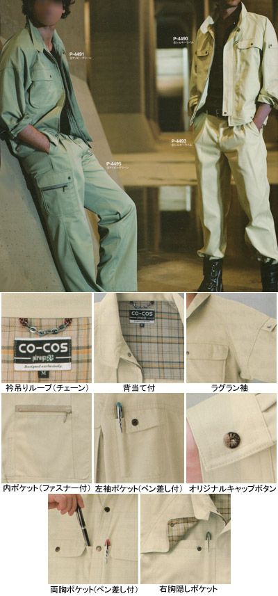 ●機能:背当て付、衿吊りループ(チェーン)、ラグラン袖、右胸隠しポケット、両胸ポケット(ペン差し付)、左袖ポケット(ペン差し付)、内ポケット(ファスナー付)、オリジナルキャップボタン、再生PET繊維60%使用