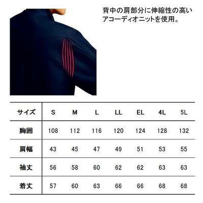 ●関連商品※52300ジャンパー※52304長袖シャツ※52302ノータックカーゴパンツ●秋冬用●素材/パワーテックスプラス3D ポリエステル65%綿35%●背当プリント●右胸ポケットファスナーロゴ入りスライダー●デザインボタン●背中アコーディオニット●左袖ペン差し●消臭&抗菌テープ(両脇・両肩)●ワンポイント●飾りステッチ●背中の肩部分に伸縮性の高いアコーディオニットを使用。●サイズ:S(胸囲/108、肩幅/43、袖丈/56、着丈/57)、M(胸囲/112、肩幅/45、袖丈/58、着丈/60)、L(胸囲/116、肩幅/47、袖丈/60、着丈/63)、LL(胸囲/120、肩幅/49、袖丈/62、着丈/66)、EL(胸囲/124、肩幅/51、袖丈/62、着丈/66)、4L(胸囲/128、肩幅/53、袖丈/63、着丈/68)、5L(胸囲/132、肩幅/55、袖丈/63、着丈/68)●カラー:ネイビー、シルバー、キャメル、シックブラック