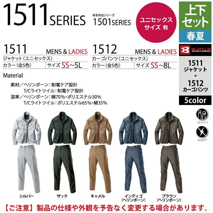 バートル定番大人気シリーズ 幅広い業種に対応 バートル BURTLE 作業着 上下セット 1511 と 1512 ジャケットセットアップ 作業服 おしゃれ 春夏 JIS適合制電 作業ズボン