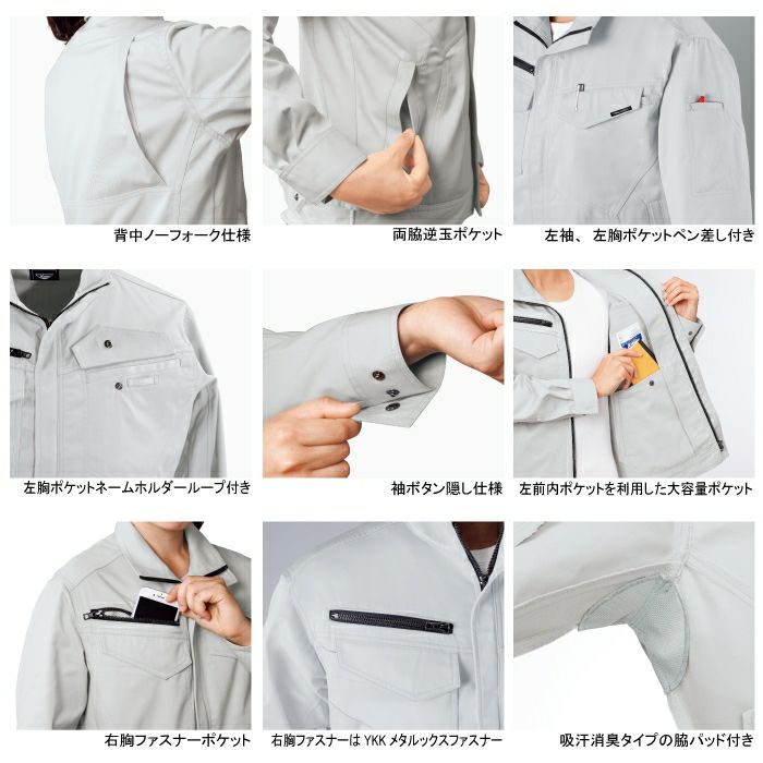 ●関連商品※1695※1697※1698※1699※1700●春夏用●素材:トロピカル●混率:ポリエステル65% 綿35% ●特徴:樹脂ファスナー、金属ボタン(ドットボタン)、右胸ファスナーポケット(巾12cmx深さ18.5cm)、右胸ポケット(巾12cmx深さ14.5cm)、左胸ポケット(巾13cmx深さ15cm)、背中ノーフォーク、左胸ポケットネームホルダーループ付き、右胸ポケットファスナー、両脇、袖ボタン隠し仕様、左袖、左胸ポケットペン差し、吸汗消臭タイプ、左前内側内ポケット●機能:帯電防止素材、通気性抜群、清涼素材●サイズ:7号(肩巾/40、胸囲/103、袖丈/53、着丈/56)、9号(肩巾/42、胸囲/106、袖丈/55、着丈/58)、11号(肩巾/42、胸囲/109、袖丈/55、着丈/58)、13号(肩巾/43、胸囲/112、袖丈/56、着丈/58)、15号(肩巾/44、胸囲/116、袖丈/56、着丈/59)、17号(肩巾/45、胸囲/120、袖丈/57、着丈/59)、19号(肩巾/46、胸囲/124、袖丈/57、着丈/60)●カラー:モスグリーン、ディープネイビー、シルバーグレー、チャコールグレー