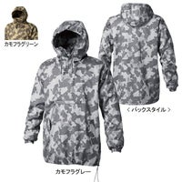 ●関連商品※10040ヤッケパンツ●春夏用●素材:綿100% ●マチ付きファスナー、フードにドローコード、ファスナーポケット、フラップ付きポケット、裾に丸ゴム入り+ストッパー、袖ペン差し、袖口にゴム入り、肌触りが良く吸湿性のある綿100% 素材●サイズ:F(胸囲/122、肩巾/55、着丈/77、袖丈/58)、3L(胸囲/130、肩巾/59、着丈/81、袖丈/62)、4L(胸囲/138、肩巾/61、着丈/83、袖丈/64)●カラー:カモフラグレー、カモフラグリーン