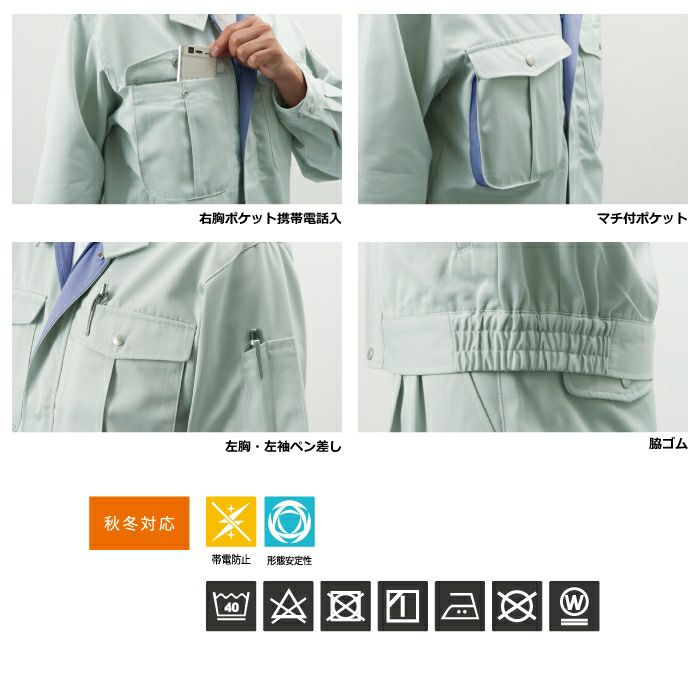 ●関連商品※1416ブルゾン※1413ツータックカーゴパンツ※1405長袖シャツ※1411ツータックスラックス●秋冬用●素材:ソフトツイル(導電繊維混入) ポリエステル65% 綿35%●帯電防止、形態安定性、右胸携帯電話ポケット、マチ付ポケット、左胸・左袖ペン差し、脇ゴム●サイズ:S(着丈/61、肩巾/45、袖丈/53、胸囲/106)、M(着丈/63、肩巾/47、袖丈/55、胸囲/111)、L(着丈/65、肩巾/49、袖丈/57、胸囲/116)、LL(着丈/67、肩巾/51、袖丈/59、胸囲/121)、3L(着丈/69、肩巾/53、袖丈/61、胸囲/126)、4L(着丈/69、肩巾/55、袖丈/61、胸囲/131)、5L(着丈/69、肩巾/57、袖丈/61、胸囲/137)、6L(着丈/69、肩巾/59、袖丈/61、胸囲/143)●カラー:グレー、サーフ、ネイビー、グリーン