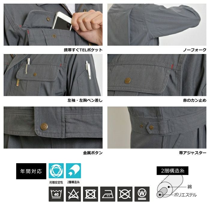 ●関連商品※8816ワークジャンパー※8815ワークシャツ※8809モバイルエプロン※8813カーゴパンツ※8811ワークパンツ●オールシーズン用●素材:チペア/チペアシーティング 綿70% ポリエステル30%●形態安定性、2層構造糸、携帯すぐTELポケット、ノーフォーク、左胸・左袖ペン差し、赤のカン止め、金属ボタン、帯アジャスター●サイズ:S(着丈/61、肩巾/45、袖丈/53、胸囲/106)、M(着丈/63、肩巾/47、袖丈/55、胸囲/111)、L(着丈/65、肩巾/49、袖丈/57、胸囲/116)、LL(着丈/67、肩巾/51、袖丈/59、胸囲/121)、3L(着丈/69、肩巾/53、袖丈/61、胸囲/126)、4L(着丈/69、肩巾/55、袖丈/61、胸囲/131)、5L(着丈/69、肩巾/57、袖丈/61、胸囲/137)、6L(着丈/69、肩巾/59、袖丈/61、胸囲/143)●カラー:カーキ、オリーブ、オレンジ、スミクロ