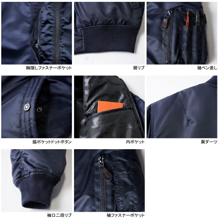 ●秋冬用●素材:[表]ナイロン100% [裏]エンボス迷彩 ポリエステル100% [中綿]ポリエステル100%樹脂ファスナー、金属ボタン●撥水、胸隠しファスナーポケット、脇ポケットドットボタン、袖口二段リブ、裾リブ、肩ダーツ、袖ペン差し、袖ファスナーポケット、内ポケット●サイズ:S(胸囲/114、肩巾/45、着丈/62、袖丈/66)、M(胸囲/118、肩巾/47、着丈/64、袖丈/67)、L(胸囲/122、肩巾/49、着丈/66、袖丈/68)、LL(胸囲/126、肩巾/51、着丈/68、袖丈/69)、3L(胸囲/132、肩巾/53、着丈/70、袖丈/70)、4L(胸囲/140、肩巾/55、着丈/72、袖丈/70)、6L(胸囲/150、肩巾/57、着丈/72、袖丈/70)●カラー:ネイビー、ブラック、アーミー
