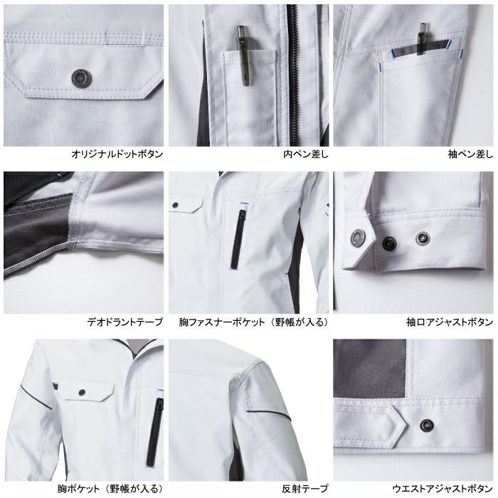●関連商品※3012-08カーゴパンツ※3012-09スラックス●オールシーズン用●素材:ポリエステル80% 綿20%金属ファスナー、金属ボタン、金属ボタン(隠しドットボタン)●制電性素材、ストレッチ、消臭、レディース対応、野帳ポケット、反射、背メッシュ、ファスナー隠し、オリジナルドットボタン、デオドラントテープ、胸ポケット(野帳が入る)、反射テープ、袖ペン差し、内ペン差し、胸ファスナーポケット(野帳が入る)、袖口アジャストボタン、ウエストアジャストボタン●サイズ:SS(胸囲/95、肩巾/40、着丈/60、袖丈/54)、S(胸囲/101、肩巾/42、着丈/62、袖丈/56)、M(胸囲/107、肩巾/46、着丈/63、袖丈/58)、L(胸囲/111、肩巾/48、着丈/65、袖丈/60)、LL(胸囲/115、肩巾/50、着丈/67、袖丈/62)、3L(胸囲/121、肩巾/52、着丈/69、袖丈/63)、4L(胸囲/129、肩巾/54、着丈/71、袖丈/63)、6L(胸囲/139、肩巾/58、着丈/71、袖丈/63)●カラー:ネイビー、ブラック、シルバーグレー、チャコールグレー