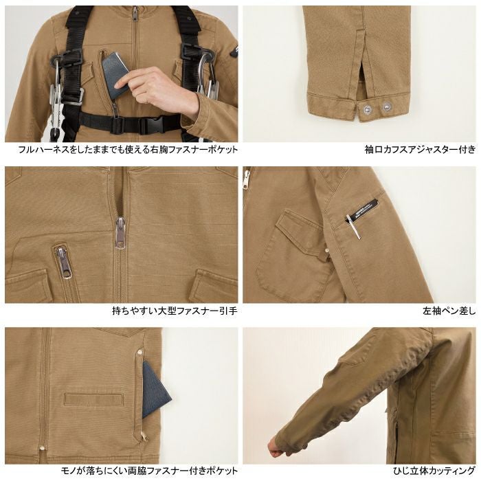 スタイリッシュで動きやすい。フルハーネスにも対応した現場服。ストレッチキャンバス素材にオイルコーディング、さらにバイオウォッシュを施した独特の質感が新しい現場服。フルハーネスをしたままでも使えるポケットやモノの落下を防止するファスナーポケットを装備。
