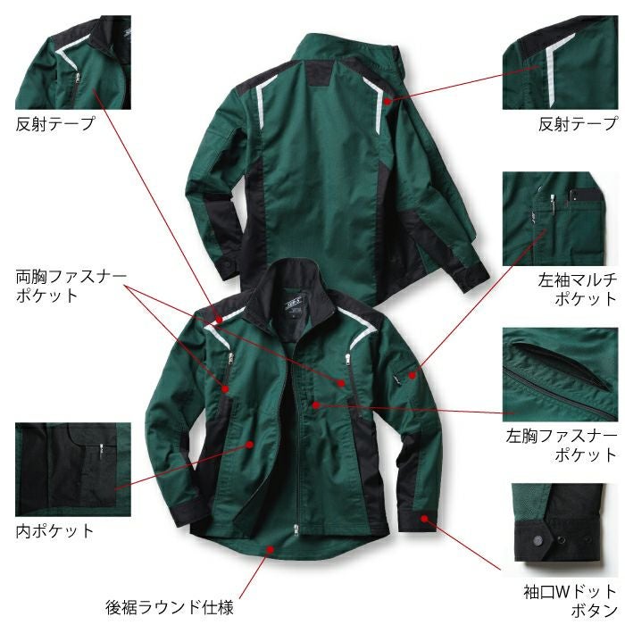 ●関連商品※WA22004ノータックパンツ※WA22005ノータックカーゴパンツ●秋冬用●素材:ストレッチツイル●混率:ポリエステル77%・綿23%、ファスナー/[フロント]プラスチック(引き手 金属) [ポケット]プラスチック(引き手 金属)、ボタン/プラスチック●ストレッチ、反射テープ、両脇ファスナーポケット、内ポケット、後裾ラウンド仕様、袖口Wドットボタン、左胸ファスナーポケット、左袖マルチポケット、スタイリッシュなデザイン、スマートシルエット、ユーロスタイル、高ストレッチ性TCツイル、シャープな反射テープ、フルハーネス着用でも使用できる両脇ポケット、スマホ収納可能なマルチポケット●サイズ:S(着丈/66、肩巾/44、袖丈/55、胸囲/104)、M(着丈/68、肩巾/46、袖丈/57、胸囲/109)、L(着丈/70、肩巾/48、袖丈/59、胸囲/114)、LL(着丈/72、肩巾/50、袖丈/61、胸囲/119)、3L(着丈/74、肩巾/52、袖丈/63、胸囲/124)、4L(着丈/74、肩巾/54、袖丈/63、胸囲/132)、5L(着丈/74、肩巾/56、袖丈/63、胸囲/140)、6L(着丈/74、肩巾/59、袖丈/63、胸囲/148)●カラー:ネイビー、シルバー、グリーン、ブラック